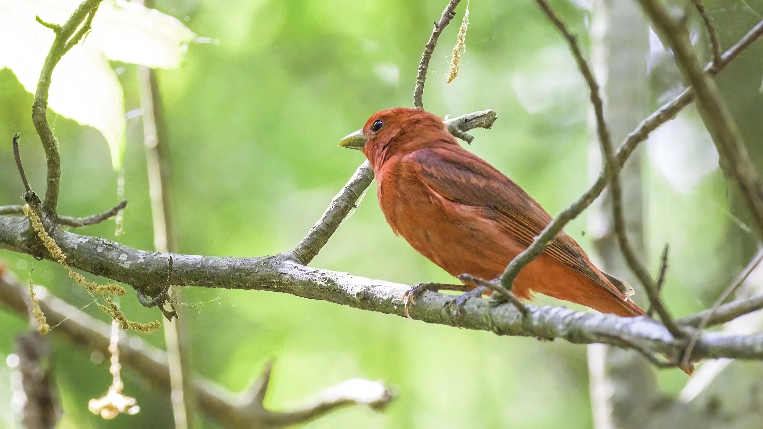 Time to head into the wooded trail at the “Bluff Unit” of the refuge. My primary target bird here is the Prothonotary warbler, a gorgeous bright yellow warbler which loves the swampy areas I’llencounter along this trail. I was happy to find a surprise bird on my way into the woods, the Summer tanager.