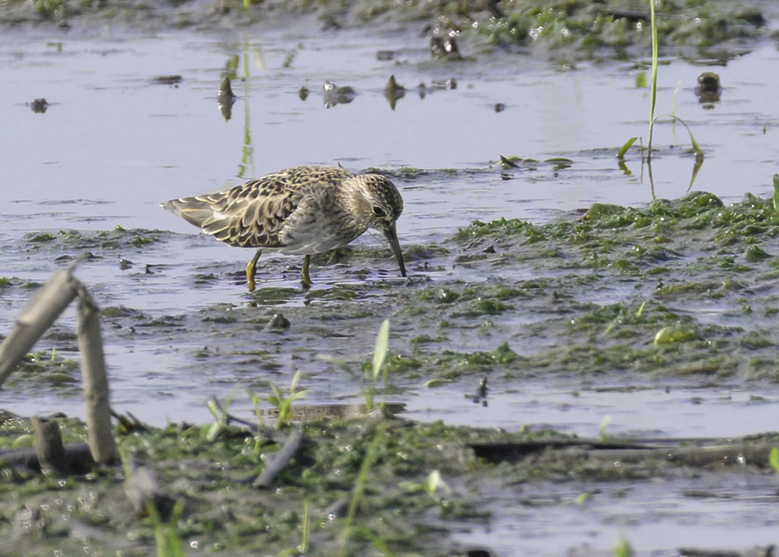 Eventually, the two species wandered in close proximity to one another giving us a nice size comparison between the two. As far as sandpipers go, the Solitary is considered a “small” sandpiper. But when you see the two species we were watching today standing close to one another, it is easy to see how the “Least” got its name.