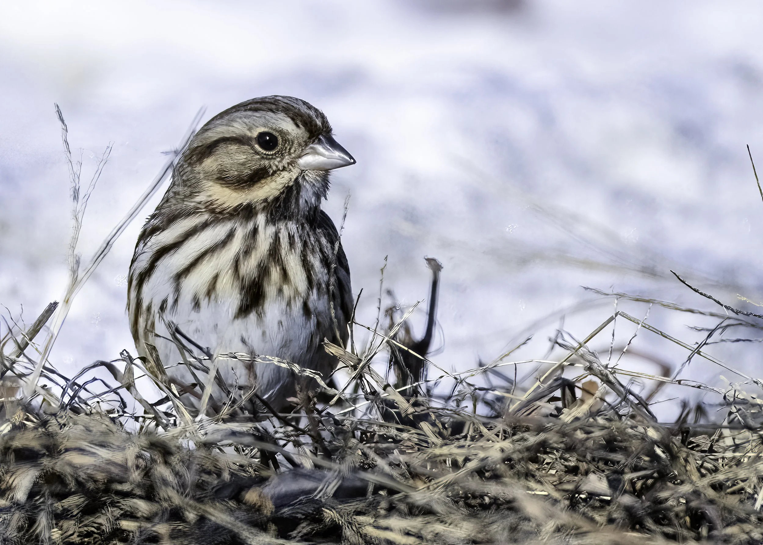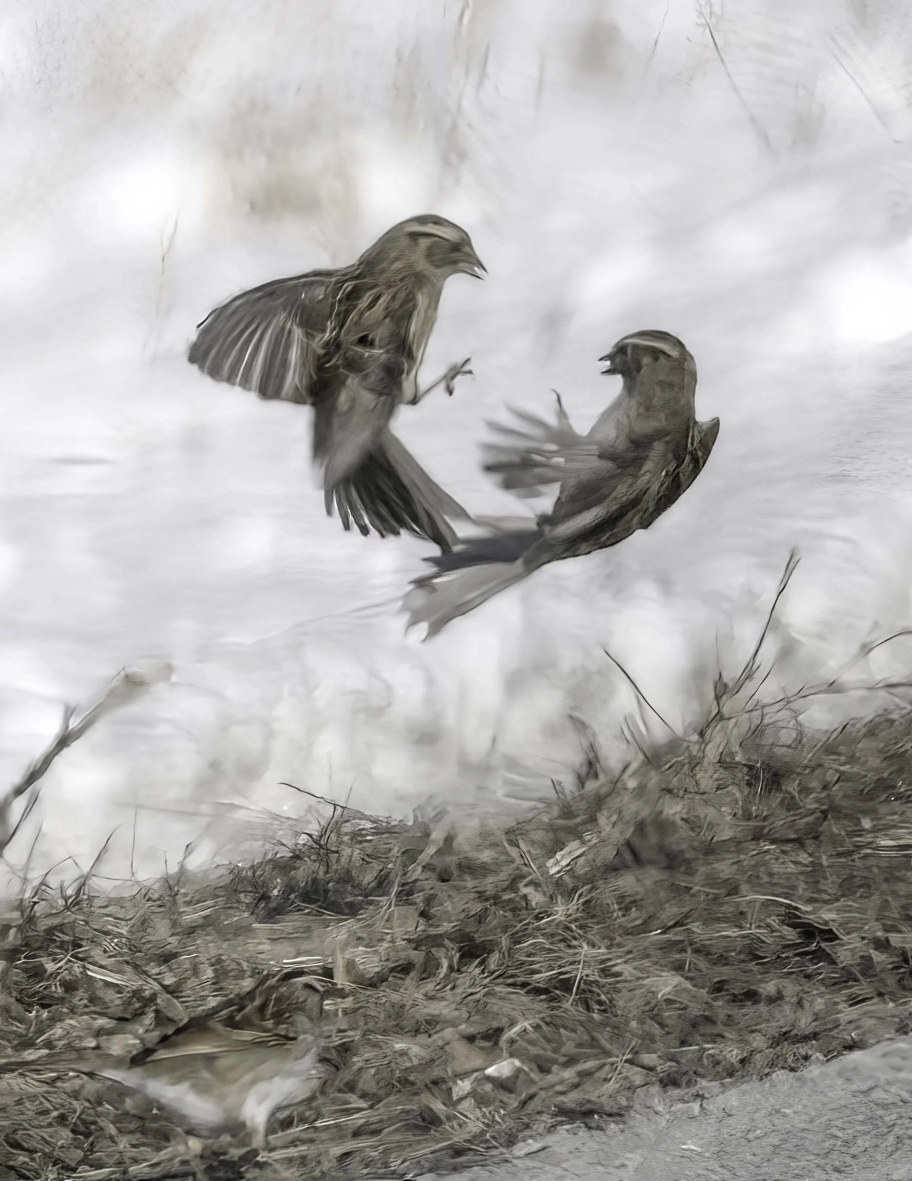 When I first looked at the image above “out of camera”, I almost deleted it because it was exceptionally blurry. I had shot it through the front window of the car and was rewarded with a distorted, grainy, blurry image. I loved the interplay between the two sparrows, however, and was determined to see if I could “save” it. In the end, I used Lightroom, Luminar Neo, and Photoshop in little increments to finally get the image above. Now is this suitable for enlarging and framing? Far from it. But it does tall a story. I was photographing a flock of sparrows all feeding along a roadside in Orange County NY. The vegetation in which they were grabbing seeds and perhaps an insect or two stretched as far as the eye could see. And yet these two had to have whatever it was that occupied this fraction of an inch plot of turf. So for documenting this little moment of avian interplay, I can live with the less than stellar quality of the photograph.