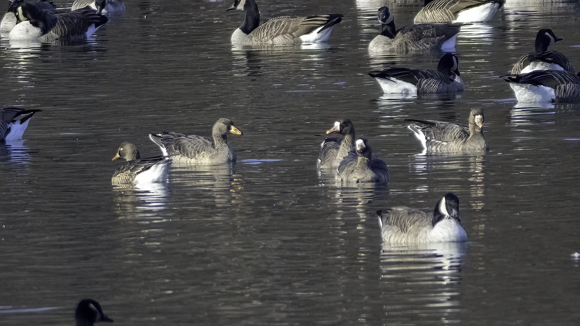 Greater White-fronted geese and Canada geese all sharing the same pond. 12/7/25