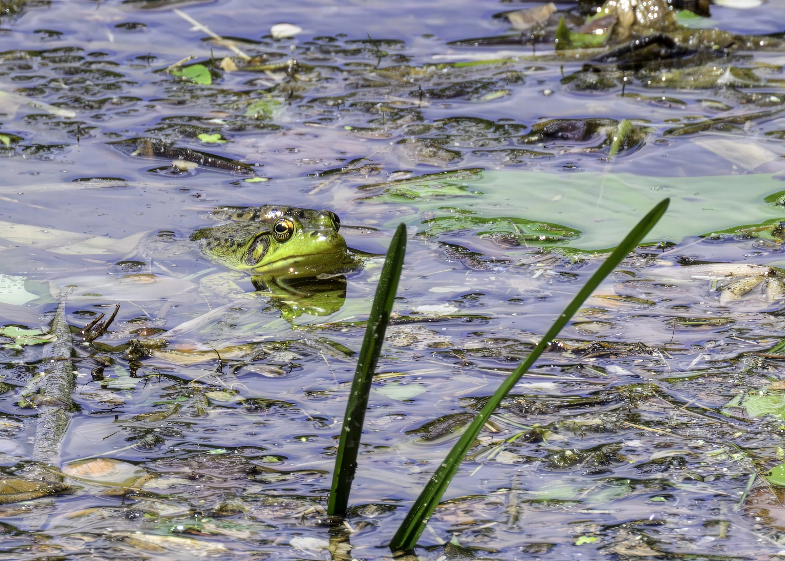 A Green frog was found partially submerged in the waters of the reservoir. Their call, heard from several more of his species on the other side of the pond, is said to be reminiscent of the strumming of a banjo. Click the button below to hear his call and the calls of other frogs you may hear at a nearby pond.