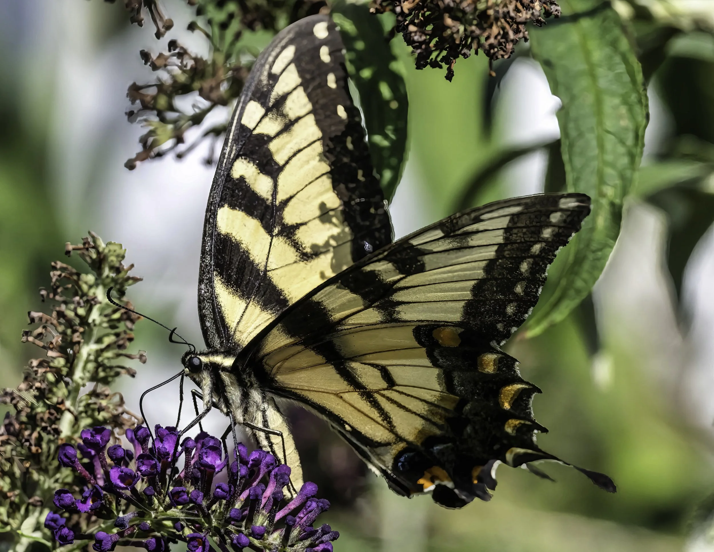 A much easier butterfly to photograph is the Eastern Tiger Swallowtail. These swallowtails exhibit what is known as sexual dimorphism meaning that the two sexes can be determined by certain distinctive characteristics. This is a typical male coloration of yellow with black stripes (like a tiger naturally) while the female may either be much darker or similar in color to the male except for iridescent blue on the hind wings. Females also tend to be larger than the males. In any case, these are some of the most beautifully patterned and easily recognizable butterflies to visit our garden.