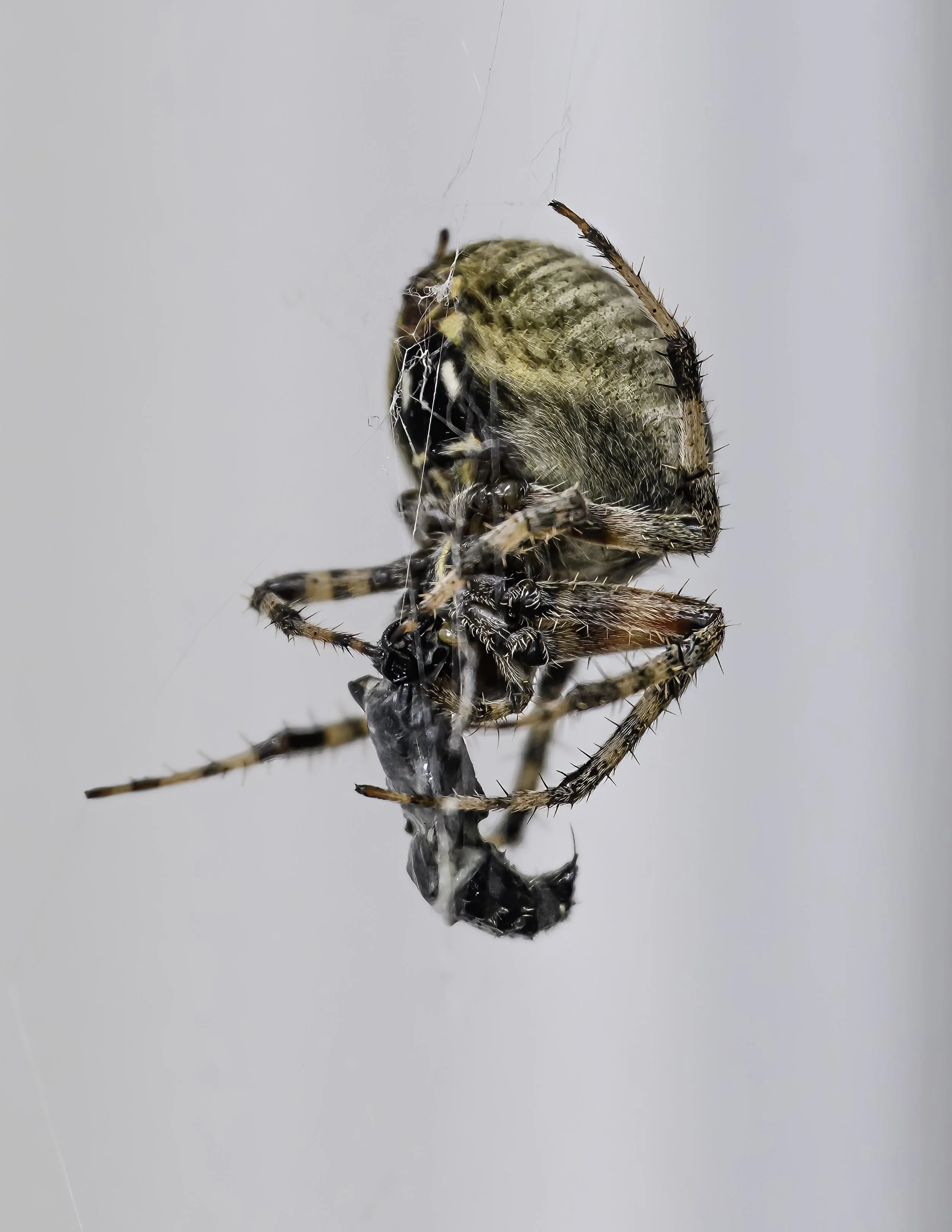 Now, back to the action. This morning, I checked my web and found that a wasp had flown into the sticky silk structure and become ensnared. The spider which has very poor eyesight, sensed the movement within the nest and proceeded to the wasp’s location guided by the vibrations of the web strands. Once she reached the wasp, she immediately began to encase her victim in the sticky thread being extruded by a “spinneret”. The silk thread is originally extruded through this organ located on the underside of her abdomen through spigots as a liquid which quickly solidifies into the thread upon contact with the air. The spider can actually produce different types of silk depending upon the intended use - silk for webs, draglines, egg sacs, and in this case wrapping up its prey.