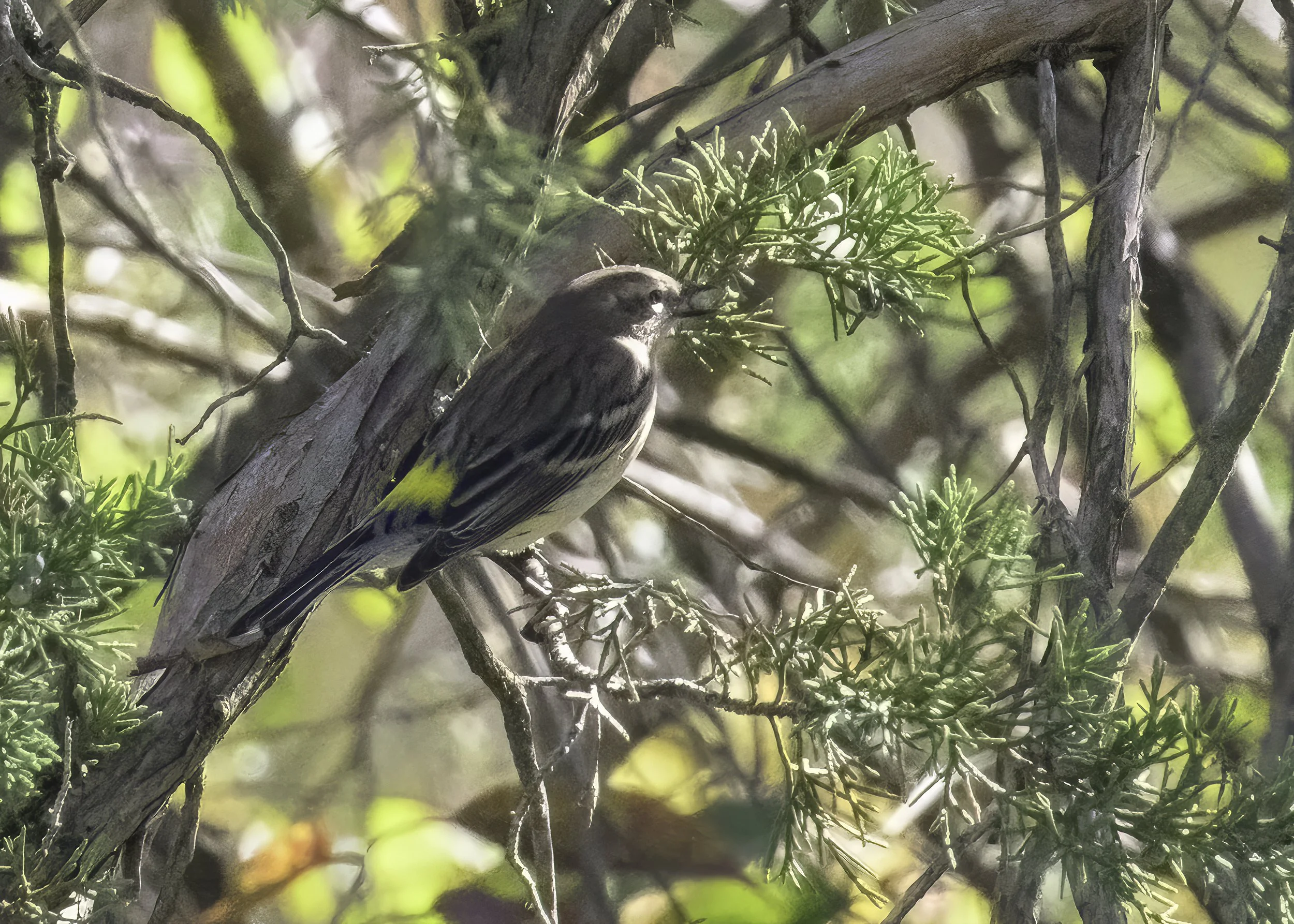 Many birds including warblers and fly-catchers like the phoebe migrate from New York in winter primarily due to changes in temperature and food availability. As cold weather sets in, insect populations, the main food source for many birds, decline sharply. To survive, these birds travel to warmer southern regions where insects remain abundant, ensuring they have enough nutrition through the winter months. This seasonal migration helps maintain their energy levels and overall health, allowing them to return to New York in the spring for breeding. This Yellow-rumped warbler has a more varied diet than many warblers and fly-catchers and does not hesitate to make use of vegetation like these cedar berries to supply nutrition. Even so, this warbler will prefer to feed on insects and will be leaving us quite soon.