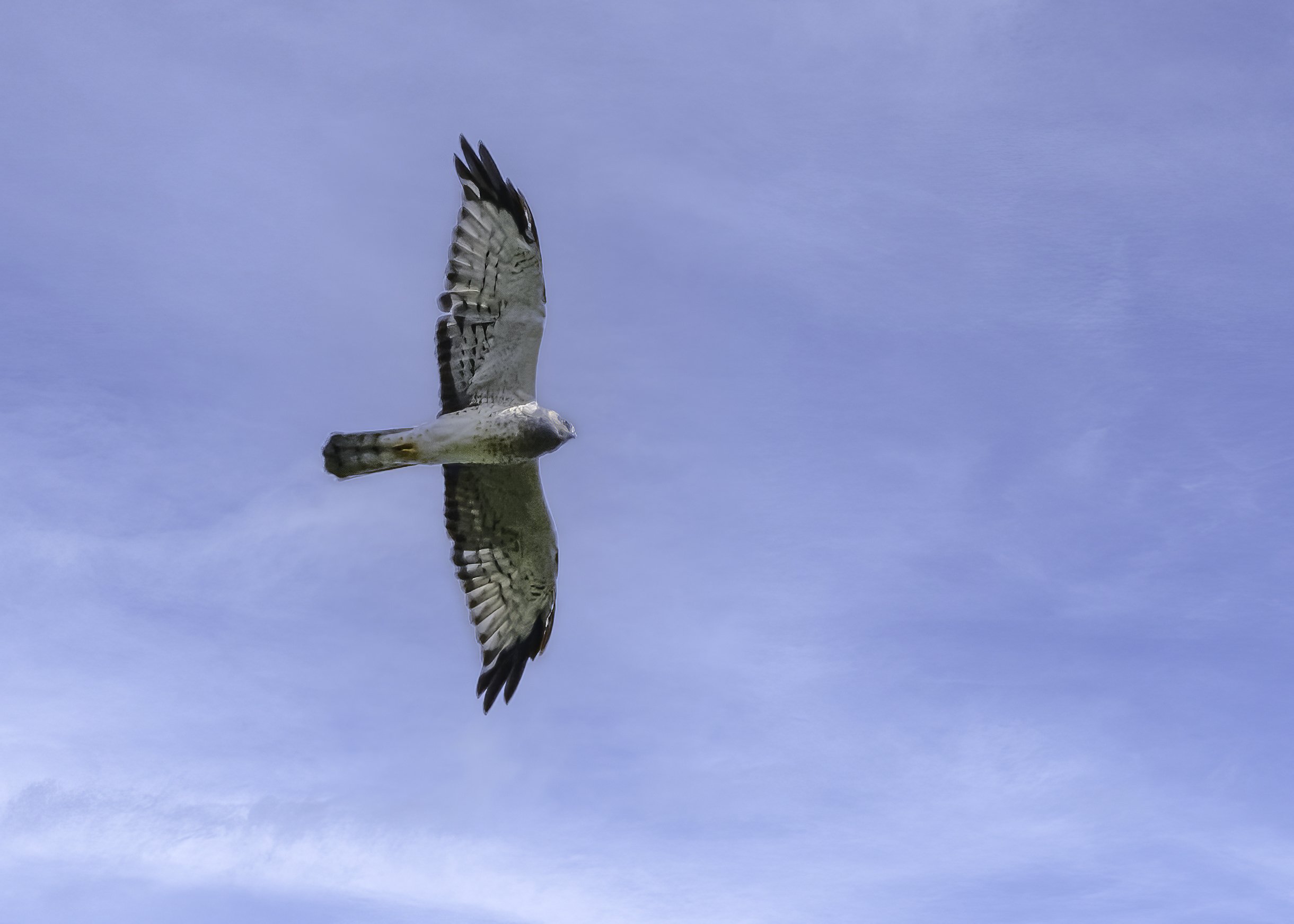 Harriers are one of the most accomplished aerialists in the world of raptors. These magnificent fliers exhibit a distinctive flight pattern characterized by slow, low gliding just above the ground, with wings held in a shallow V-shape. Their flight is often described as buoyant and graceful, allowing them to efficiently scan open fields and marshes for prey. These raptors use their keen sense of hearing and vision during flight, often flying in a zigzag or looping manner to flush out small mammals and birds. Their silent wingbeats and the ability to hover briefly enhance their hunting success, making their flight both functional and captivating to observe. And so, to see them at a considerable height is to witness them in a whole different posture and repertoire of movement. It’s always a joy for me to see these birds as they hold the top position on my list of favorite bird species.
