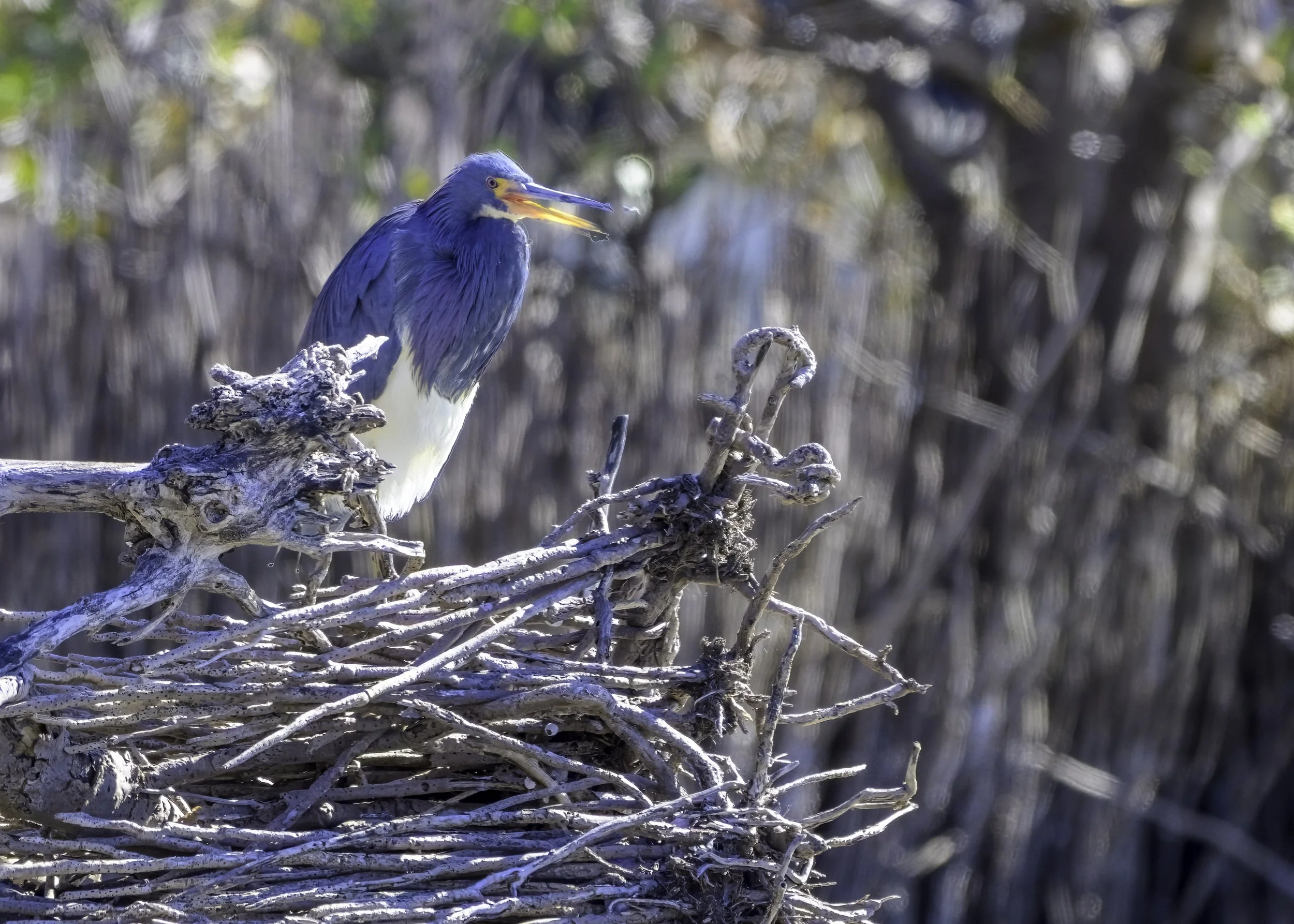 We wanted to cover a few different places today, so it was kind of a whirlwind excursion to revisit these areas. First on the list was the eagle’s nest on Volcon Road in Edgewater. We were disappointed to not see any sign of the eagles that we’re hoping will successfully nest at this site. We’ll continue to monitor the nest and hope that this was just a case of the eagles being here but out of sight. Next was Shiloh Marsh Road. At the end of the road, we took a look at the little beach along the banks of the Indian River. We found a Tricolored heron which appeared to be in distress….mouth agape as if the bird was overheated. Temperatures today are still in the low 60s, however, so why this behavior? Only the bird knows. It was also of interest that the bird was perched on what looked like a nest. In actuality, it was perched on roots of a mangrove which has been blown or washed over onto its side. The parallel “twigs” were actually the pneumatophores which normally would be upright but were now horizontal. Interesting formation.