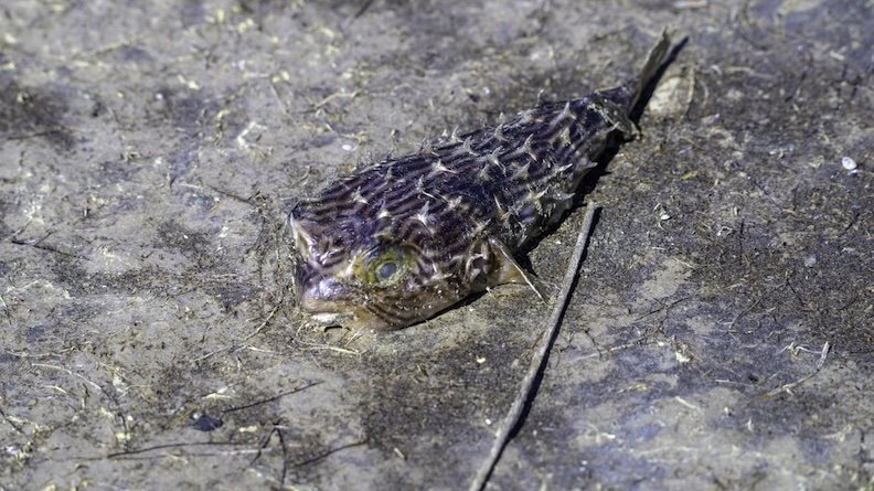 On the same beach, we found a dead fish which I had never seen before. iNaturalist identified it as a Striped Burrfish. A web search gave me the following information on this interesting fish. “Striped burrfish are small, rotund marine fish known for their short, sharp spines and distinctive banded coloration that ranges from pale cream to dark brown, helping them blend into seagrass beds and reef rubble. When threatened they can inflate by swallowing water or air, erecting their spines as a deterrent to predators; despite this defensive display they are nonaggressive toward humans but should not be handled because their skin can cause injury. Typically found in warm coastal waters of the western Atlantic, they feed on hard-shelled invertebrates—crushing prey with a beak-like dental plate—and are often spotted by divers and anglers during late summer when juveniles move into shallow bays. Their cryptic behavior, unique appearance, and role as both predator of benthic invertebrates and prey for larger fishes make them an interesting component of nearshore marine ecosystems”.