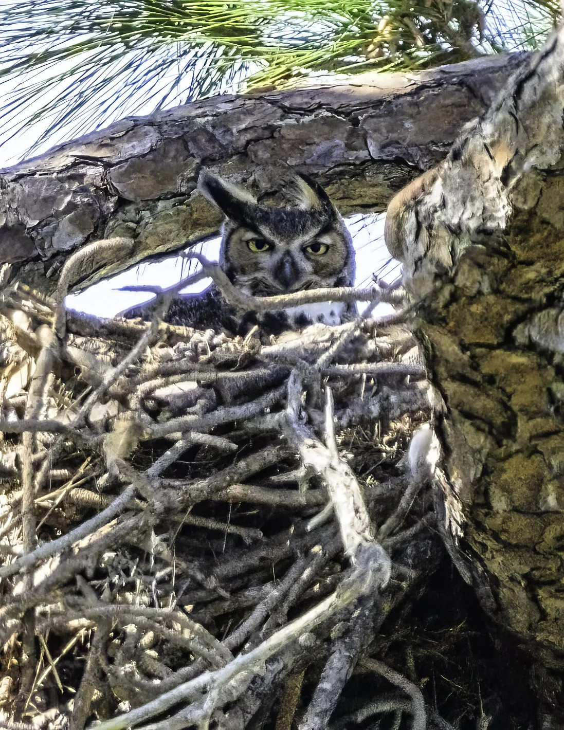 Next, it’s off to Bairs Cove Road to check on the next nest. This nest had been occupied by an eagle pair, but as we reported earlier, this nest was raided by Great horned owls who know lay claim to the site. Sure enough, both mom (on the nest) and pop (perched in a nearby tree) were present, but a volunteer who’s monitoring that nest said there was no apparent sign of any chicks at this point in time.