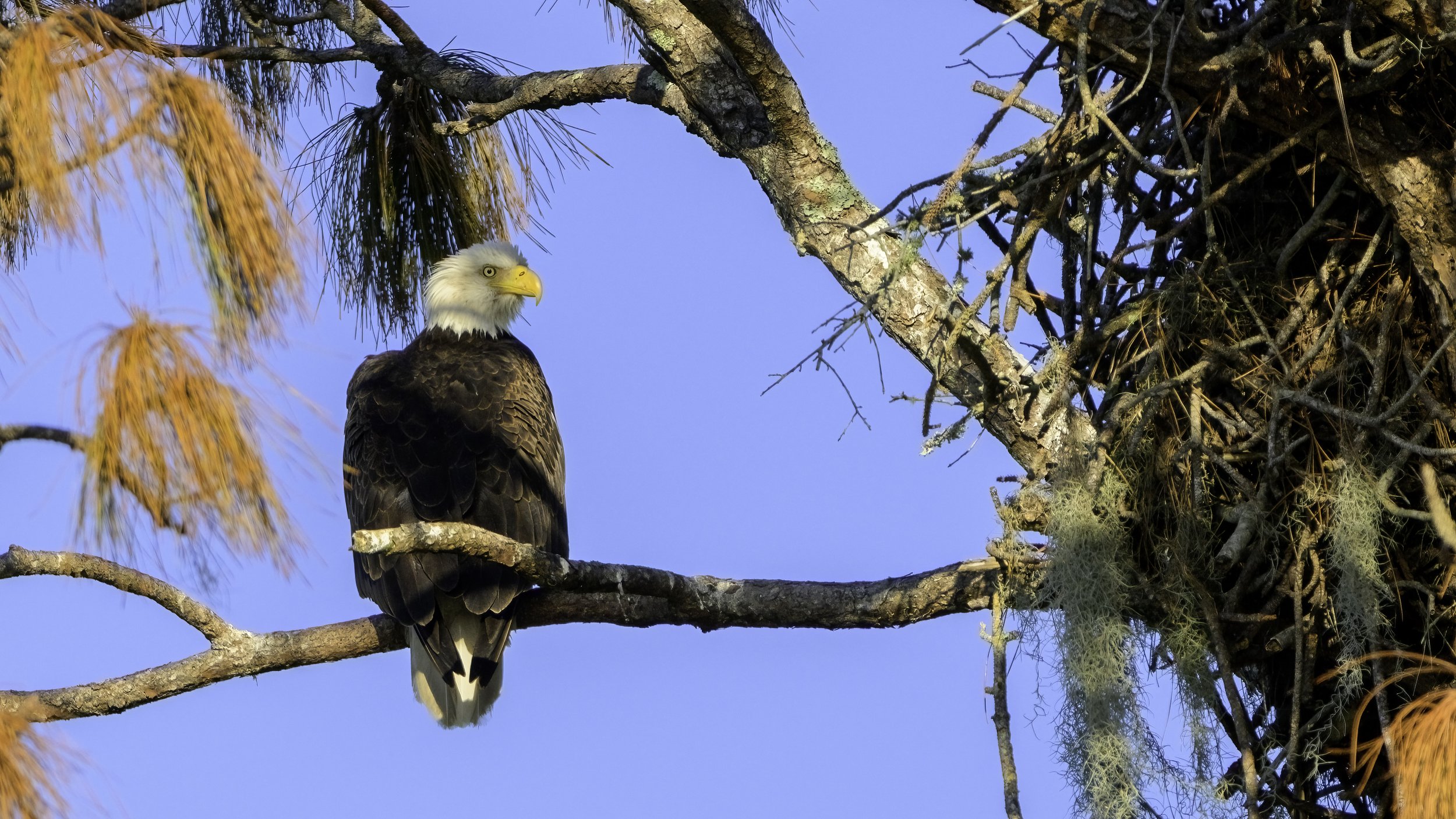 One final shot of the Ranken nest from a wider angle to give you an idea of the size of the nests we’re talking about The average height of an adult eagle is 2.5 to 3 feet tall. Compare the height of the eagle which is sitting right next to its nest to get some concept of how big these nests can be. Over the years, eagles will add to the structure perodically. Some references site that eagles nests can grow to become the size of a Volkswagen! One of the major contributing factors to nests collapsing other than hurricanes is simply that the tree can no longer sustain the weight. Looking at this nest, it’s easy to see how that could happen.