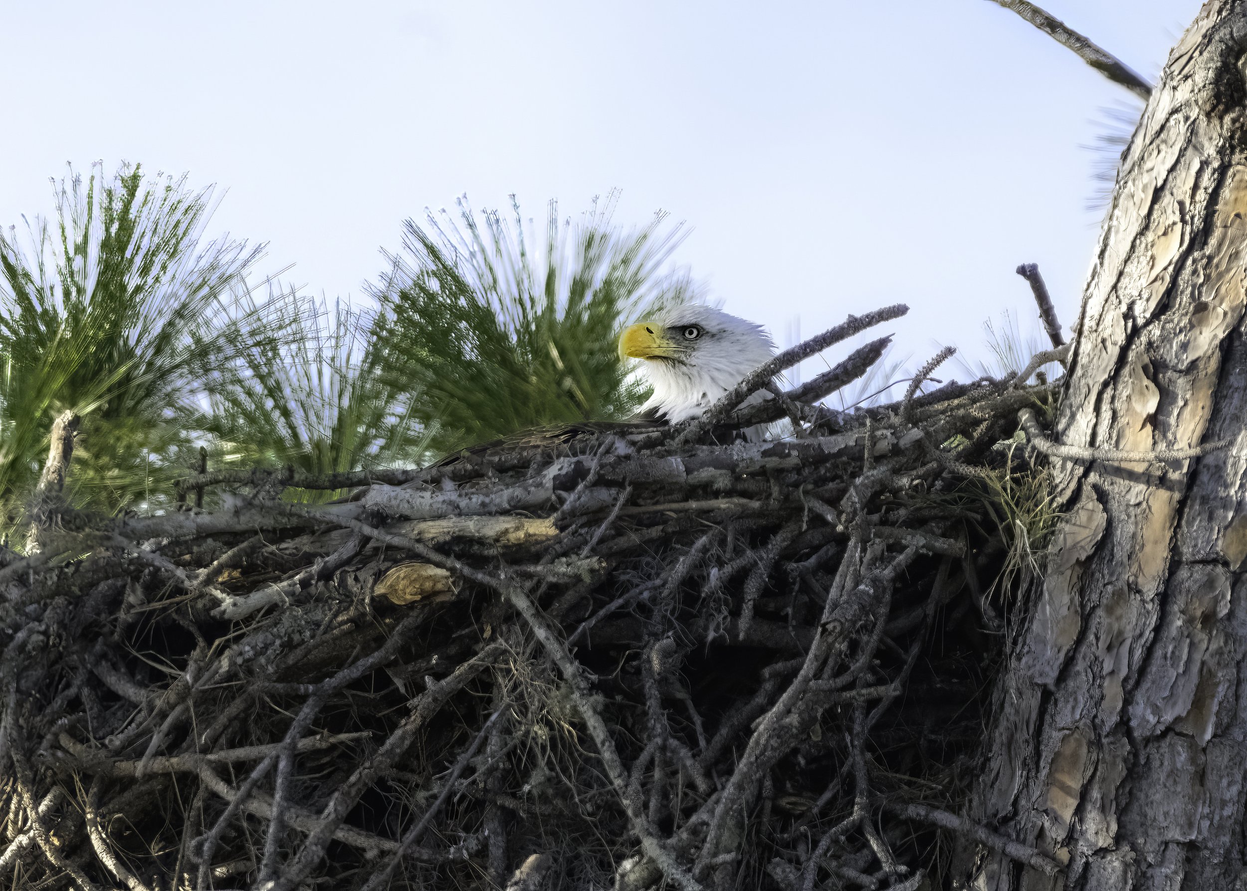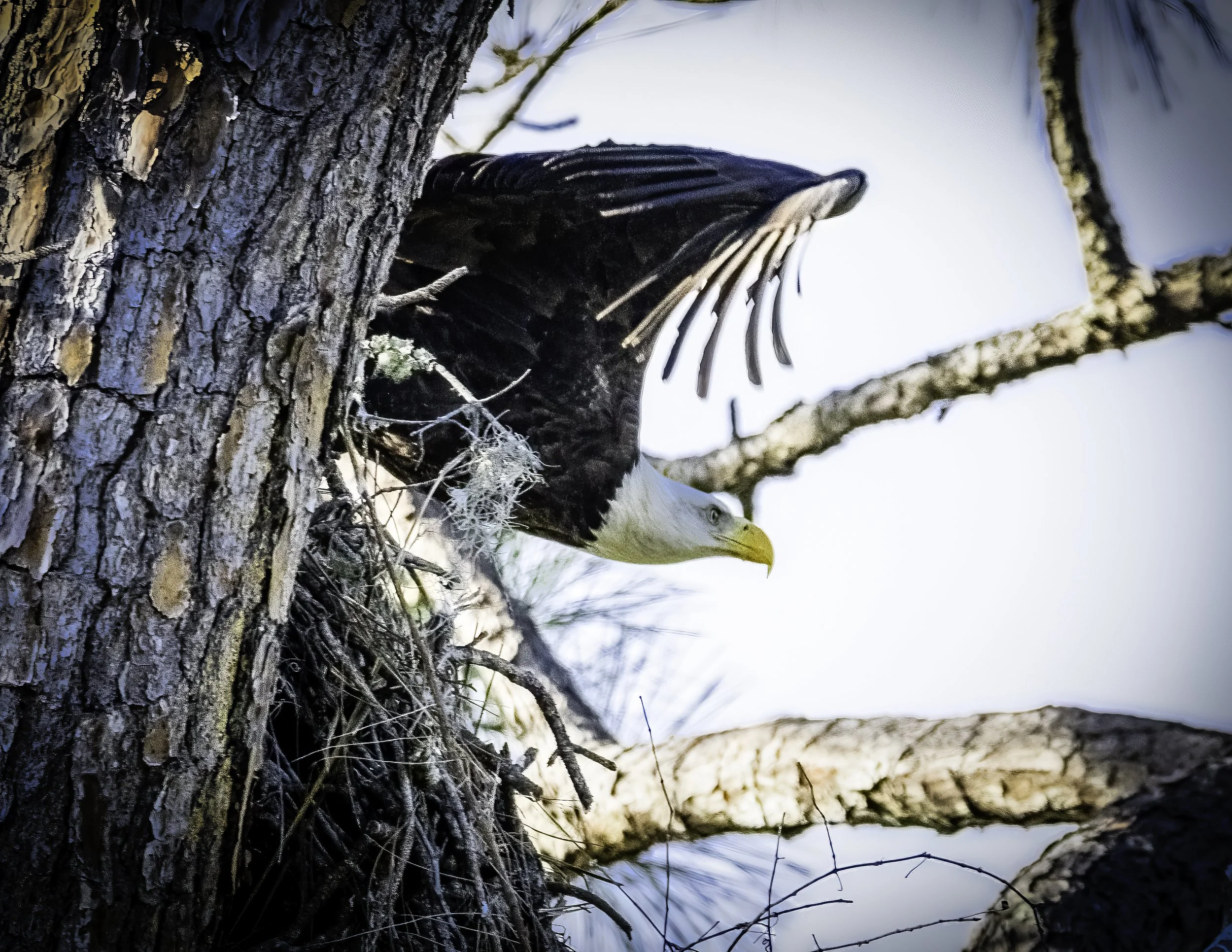 Each year, we monitor the activity in several eagles’ nests that we have located during our winters down here in Florida. The first that we always check is in Merritt Island National Wildlife Refuge on Kennedy Pkwy. Near the WSEG Boat ramp, the nest is somewhat distant, but offers a clear view to see and photograph activity.