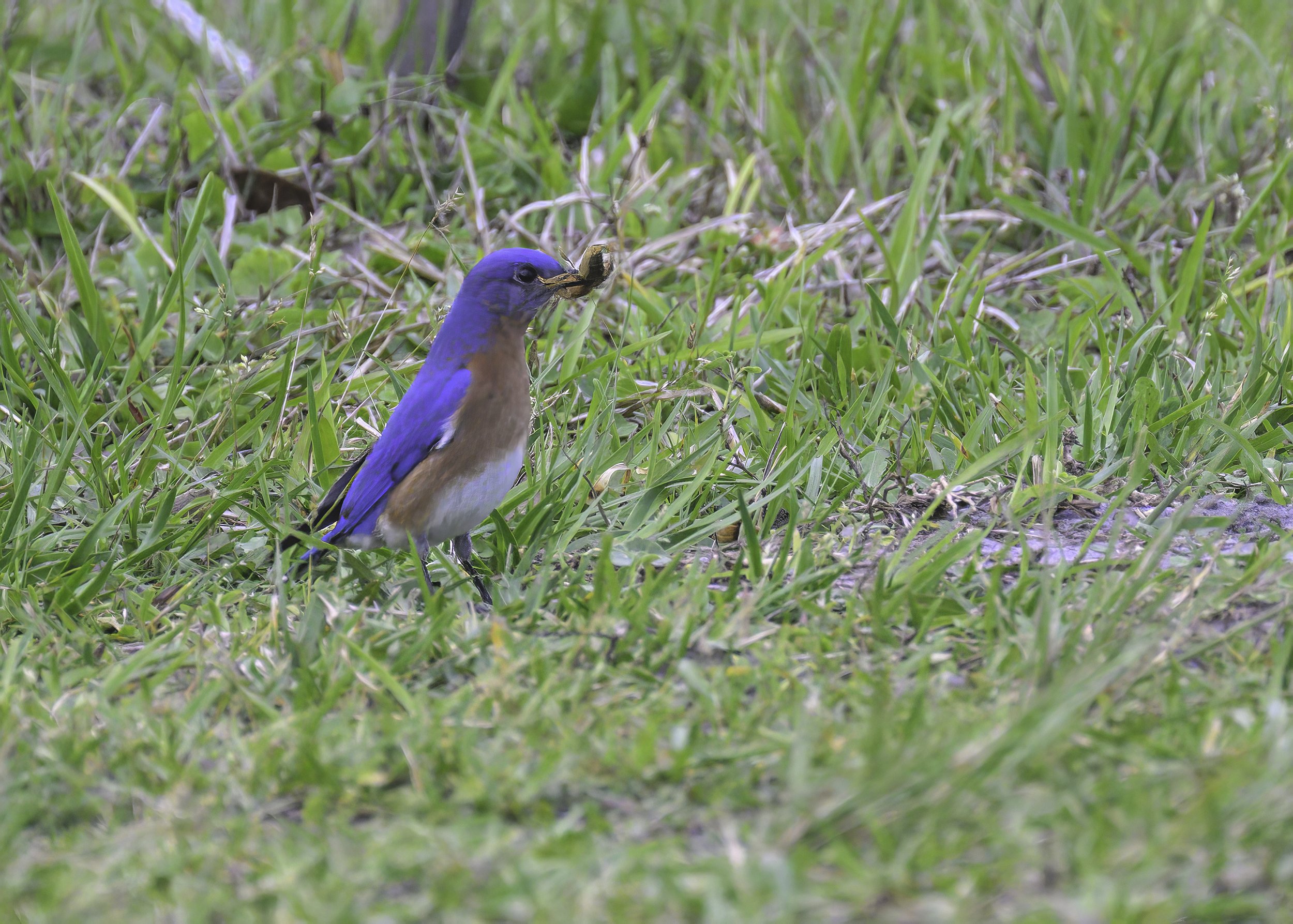 Continuing around the course, we first ran into a flock of Catbirds feeding on the berries of an invasive Brazilian pepper bush. A bit further along, we found this gorgeous Eastern bluebird. It too was enjoying its dinner, but this bird prefers good ole meat to the vegetarian diet the catbirds were dining upon. This time of year always brings out the finest colors in most birds and the plumage of this bluebird is certainly no exception.