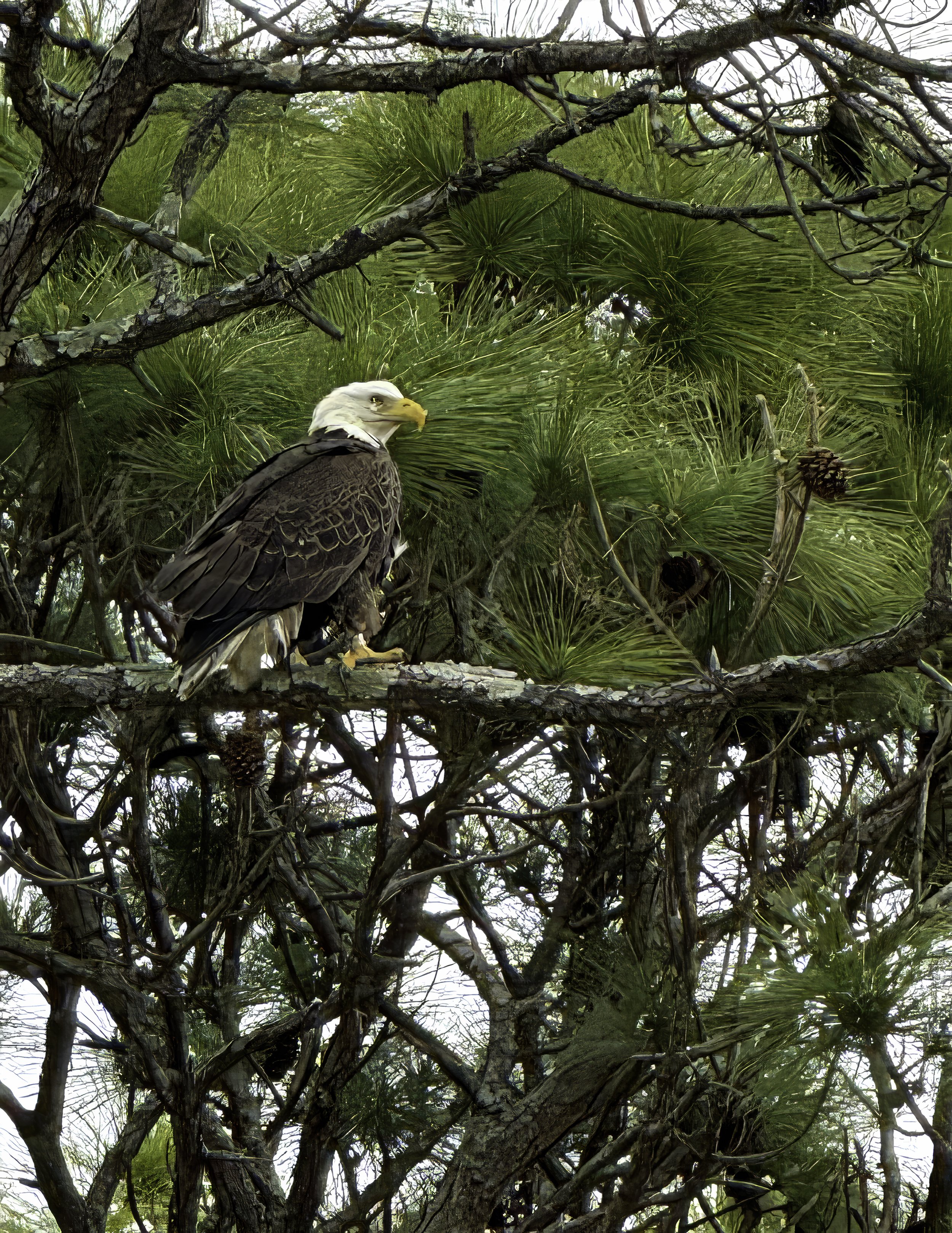 During the early afternoon round, as we approached the number 2 tee box, a beautiful Bald eagle came soaring in and landed above the tee box as if to observe and perhaps offer suggestions on how to improve my swing. A Boat-tailed grackle came in and landed on the tee box which brought in a second eagle with talons extended. He was just bluffing apparently and flew up into a second nearby tree. Couldn’t get them both in the same frame with my phone camera, but this one gives you the idea of their vigilance.