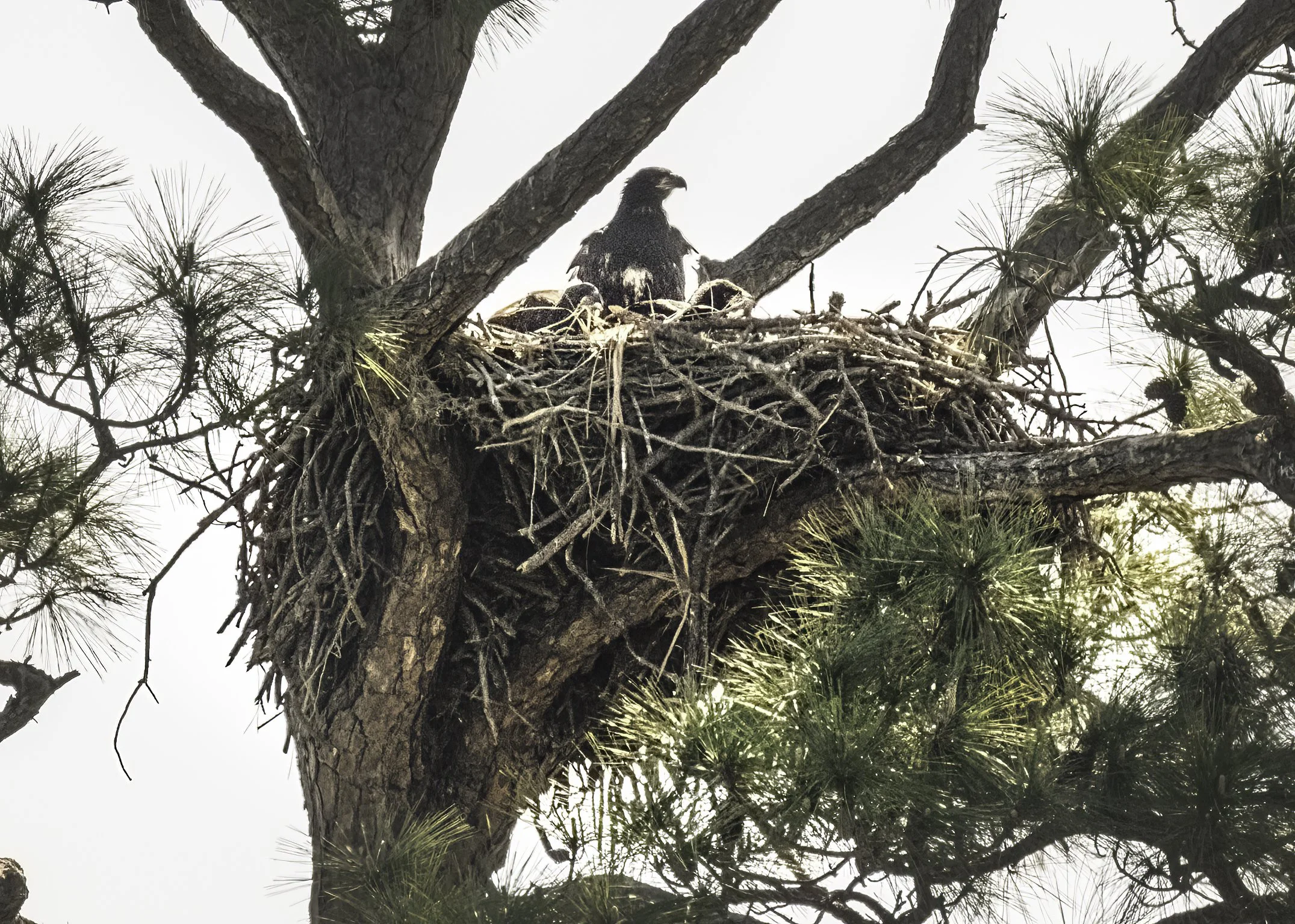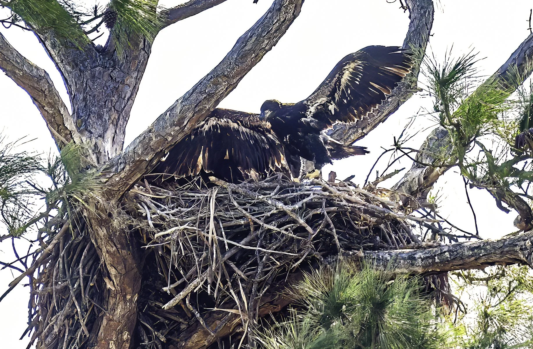 Soon an adult did indeed return to the nest with a fish and all three heads disappeared into the bottom of the nest to grab their share of nourishment. The adult soon departed as the young were gorging themselves and before long, one of the youngsters reappeared and began exercising those huge wings. The wingspan of a juvenile eagle can reach 7 feet here in Florida, so it takes some practice and conditioning to get ready for first flight!